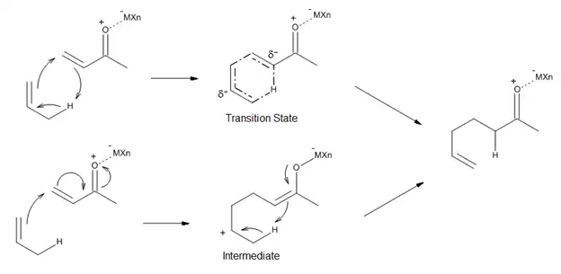 Lewisovy kyseliny mohou přímo vytvořit komplex s karbonylovým kyslíkem a proto bylo vyvinuto mnoho trialkylaluminiových katalyzátorů obsahujících vazbu C=O. Bylo zjištěno, že (CH3)2AlCl je velmi vhodným katalyzátorem enových reakcí α,β alifatických, především nenasycených, aldehydů a ketonů; tuto vlastnost má díky tomu, že příslušný komplex dále reaguje za vzniku methanu a hlinitého alkoxidu, což může zabránit přesmykům katalyzovaným protony a solvolýze, jak je znázorněno na následujícím obrázku:[3]