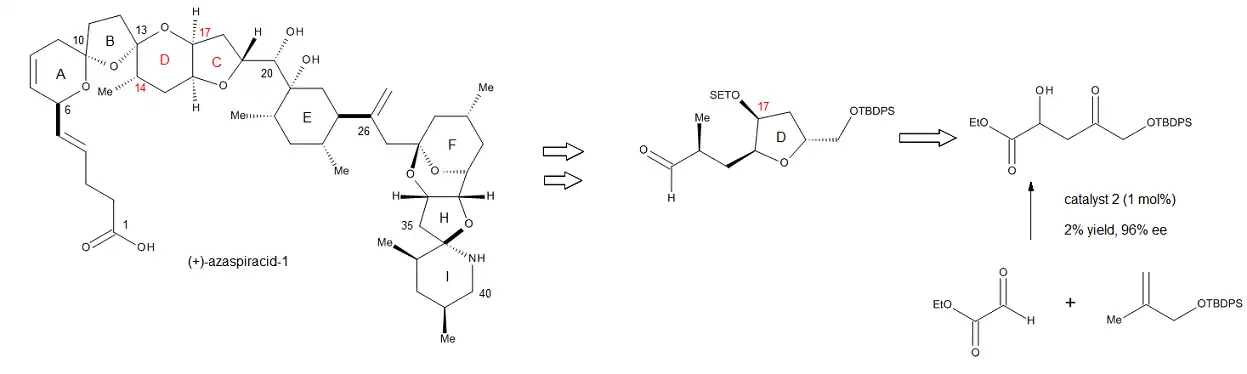 Syntetická přínosnost C2-symetrické měďnatých katalyzátorůl byla potvrzena přípravou C17 stereocentra části (+)-azaspiracid-1 kruhu (+)-azaspiracidu-1, což je jed vytvářený živočichy jako jsou ústřice, hřebenatky, škeble a srdcovky.[19] Reakce vytvářející toto stereocentrum je katalyzována 1 molárním procentem měďnatého komplexu; autoři naznačují, že i při použití 20 g bude mít reakce velmi dobrý výtěžek a vysokou enantioselektivitu. Produkt je také možné, aniž by došlo ke ztrátě selektivity, převést na odpovídající Weinrebův amid, což umožňuje snadné zavedení C14 skupiny. Tento katalyytický enantioselektivní postup lze jednoduše zahrnout do složitějších syntéz, obzvláště na žačátku procesů, kdy je důležité dosáhnout vysoké výtěžnosti.