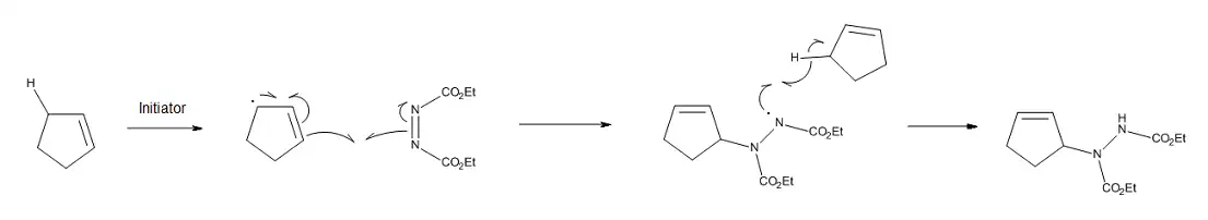 Pokud je reakce podle soustředěného mechanismu geometricky nevýhodná, tak může tepelná enová reakce probíhat biradikálově[11] nebo, pokud se v reakční směsi nacházejí iniciátory radikálů, přes volné radikály. Jako příklad lze uvést reakce cyklopentenu a cyklohexenu s diethylazodikarboxyláty, které mohou být katalyzovány iniciátory radikálů. Postupný průběh reakce je, jak je znázorněno na následujícím obrázku, podpořen cyklopentenylových a cyklohexenylových radikálů a také tím, že cyklopenten a cyklohexen by při soustředěném mechanismu obtížně zaujímaly ideální geometrii.[12]