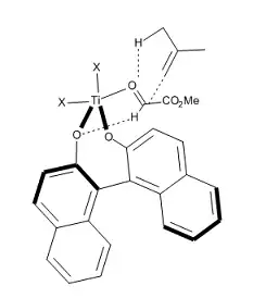 K aktuálně studovaným tématům v oblasti enových reakcí katalyzovaných Lewisovými kyselinami patří vývoj asymetrické tvorby vazeb C-C. Bylo popsáno použití chirálního komplexu titanu (viz následující obrázek) při asymetrické enové reakci za vzniku prochirálního glyoxylátového esteru.[14] Katalyzátor byl připaven na místě z (i-PrO)2TiX2 a opticky čistého binaftolu, výměna alkoxyligandů byla provedena pomocí molekulárních sít. Reakcí vznikají α hydroxyestery s vysokou enantiomerní čistotou, látky, které jsou významné biologicky i synteticky.[14]