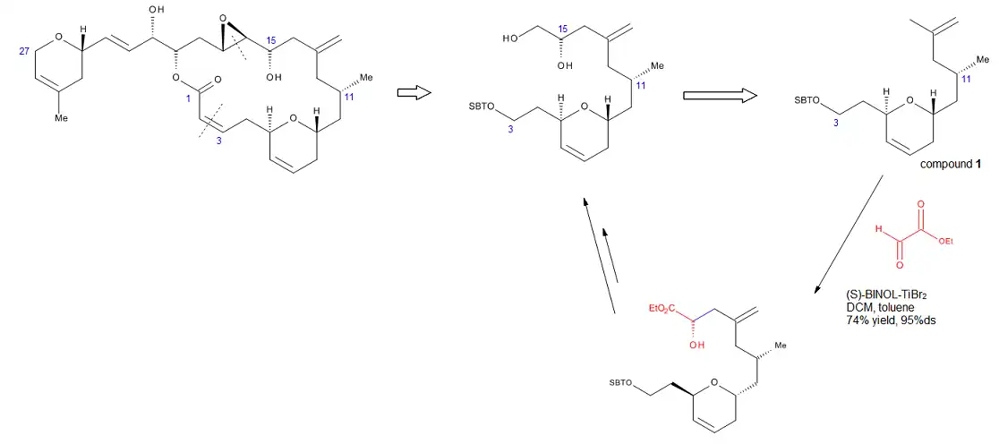 Roku 2002 byla popsána totální syntéza laulimalidu,[16] s využitím enové reakce - C3-C16 fragment jeho molekuly se vytváří chirálně katalyzovanou enovou reakcí vytvářející C15 stereocentrum. Reakcí koncové allylové skupiny sloučeniny 1 s ethylglyoxylátem za přítomnosti (S)-BINOL-TiBr2 jako katalyzátoru vzniká požadovaný alkohol se 74% výtěžností a 95% diastereomerním přebytkem.