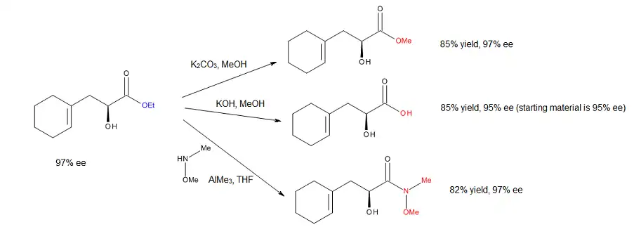 Význam postupu vyvinutého Evansem a spolupracovníky byl potvrzen úspěšnou přeměnou vznikajícího alfa-hydroxyesteru na odpovídající methylester, volnou kyselinu, Weinrebův amid a alfaazidoester, a to bez jakékoliv racemizace.[17] Azidové odstranění alkoholu představuje užitečný způsob přípravy ortogonálně chráněných aminokyselin.