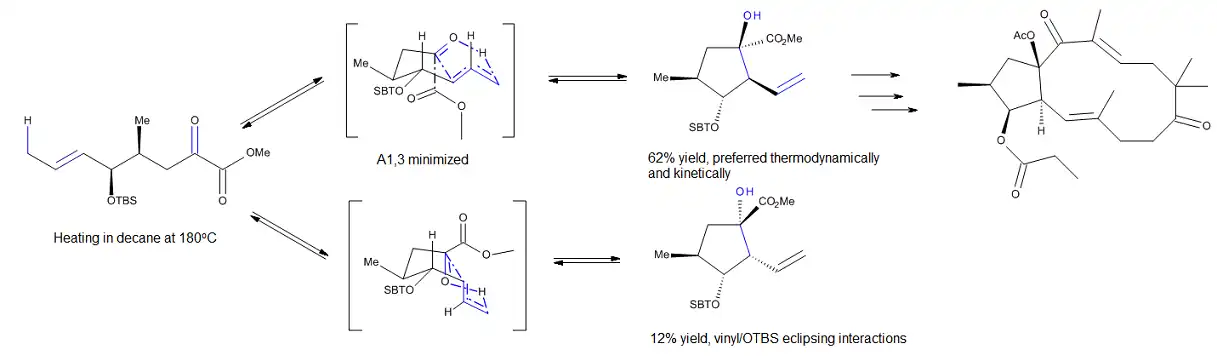 V roce 2011[9] byly prozkoumány nekatalyzhované vnitromolekulární karbonylo-enové reakce používané na přípravu cyklopentanových fragmentů přírodních i umělých jatrofa-5,12-dienů, což je skupina P-glykoproteinových modulátorů. Výpočetními metodami bylo zjištěno, že reakce může probíhat přes dva různé spojené meziprodukty s obálkovými či podobnými konformacemi. Selektivita tohoto procesu se vysvětluje vlivem 1,3-transanulárních interakcí.