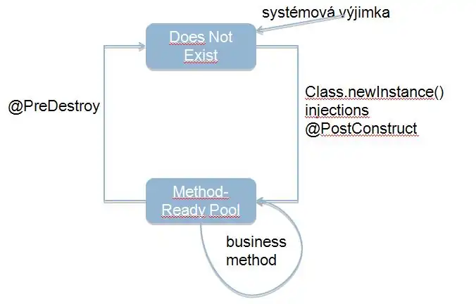 Cyklus beanu začíná ze stavu „neexistence“ vytvořením nové instance a jejím zařazením do poolu na serveru. Při vytváření instance server do beanu injektuje případné reference a volá metodu anotovanou @PostConstruct, pokud taková existuje, která může sloužit například k otevření JDBC připojení. Když je bean ve stavu method-ready-pool může obsluhovat klientské požadavky (poskytovat své business metody). V případě, že se server rozhodne uvolnit paměť zabranou beany nebo je ukončován standardním způsobem, volají se případné metody rušeného beanu anotované @PreDestroy, které slouží jako inverzní operace k post-constructu (tedy např. uzavírání databázového spojení). Stateless bean může skončit svou existenci také vyhozením systémové výjimky, která způsobí okamžité odstranění beanu z paměti (nevolá se @PreDestroy).