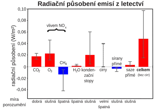 Při pokusech o shromáždění a kvantifikaci celkových klimatických dopadů letadel na klimatickou změnu odhaduje Mezivládní panel pro změnu klimatu (IPCC), že celkový dopad letecké dopravy na klimatické změny je přibližně dvojnásobek až čtyřnásobek jeho přímých emisí CO2 (s výjimkou potenciálního dopadu na zesílení řasovité oblačnosti).[25] Toto se měří jako radiační působení. I když existuje nejistota ohledně přesné úrovně dopadů NOx a vodní páry, vlády přijaly široký vědecký názor, že mají vliv. Celosvětově v roce 2005 přispěla letecká doprava „pravděpodobně až 4,9 procenty radiačního působení.“[44] Prohlášení vlády Spojeného království zdůraznilo potřebu, aby si letecká doprava řešila své celkové klimatické dopady na změny klimatu a ne pouze dopad CO2.[50] Příspěvek kondenzačních stop a cirrů z nich vyvinutých je pravděpodobně větší.[51]