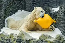 - Nejčastější způsob. Zvířata většinu volného času ve volné přírodě také tráví sháněním potravy.[6] Nejjednodušší verzí je situace, kdy zvíře nedostane potravu do misky, ale do různých míst výběhu. Již to totiž vyvolává aktivitu.[3] Dále je možné potravu různě schovávat a maskovat, aby bylo náročnější se k jídlu dostat (příklad: dřevo s vyvrtanými otvory pro klokánky králíkovité, zamrazená potrava[3] pro lední medvědy, figuríny). Mezi příklady potravního enrichmentu také patří věšení potravy do hůře dostupných míst (do výšky), natírání na stěny nebo zamrazení potravy do ledu. Zpestřením je též obměna denního rozvrhu.[6]