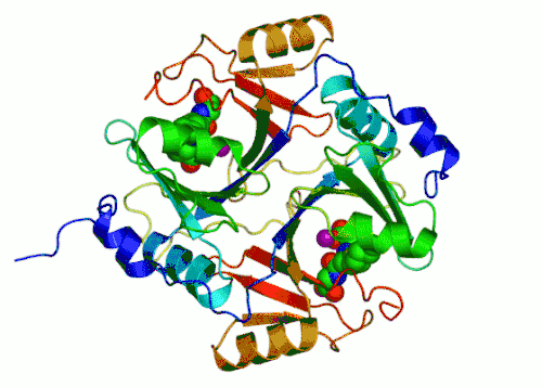 Lidská glyoxyláza I je enzym ze skupiny lyáz. V molekule enzymu převládají bílkovinné řetězce, ale navíc jsou jeho součástí dva ionty zinku (fialově) a inhibičně působící regulátor S-hexylglutathion