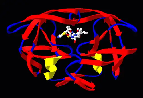 HIV proteáza s navázaným inhibitorem, ritonavirem. Tato látka brání HIV proteáze v její funkci, a proto se s úspěchem používá jako antivirotikum