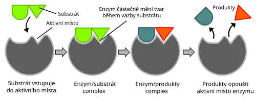 Hypotéza indukovaného přizpůsobení: toto schéma ukazuje průběh enzymatické katalytické přeměny; enzym mění svůj tvar v reakci na navázání substrátu