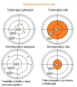 Představit si to můžeme jako na obrázku. Terč je celá populace. Střed je průměr, odchylka od průměru je SD (standard deviation). Přesnost je dána variabilitou výsledku testu. Čím větší rozptyl od středu, tím je hůř, tím je studie méně průkazná. Síla je dána procentem populace, pro kterou výsledek platí. Čím větší část terče (populace) reprezentuje, tím lépe, tím je studie silnější.