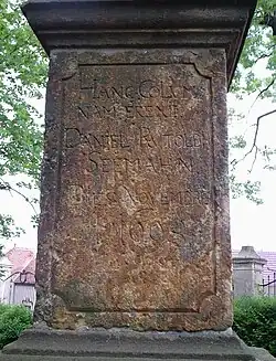Dedikační nápis z roku 1698 na podstavci sochy.