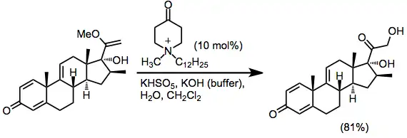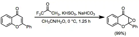 Epoxidace využívající vodné roztoky hydrogenperoxosíranu a katalytická množství ketonů lze provádět pouze s použitím určitých druhů dioxiranů (podobně jako u asymetrických reakcí) nebo v případech. kdy dioxiran nelze účinně izolovat. Produkty epoxidací se dají hydrolyzovat.[12]