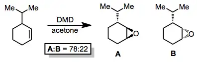 Diastereoselektivní epoxidace lze provézt u diastereotopmích alkenů. Při epoxidaci racemického 3-isopropylcyklohexenu vzniká jako hlavní produkt trans-epoxid, vytvořený atakem na stericky méně stíněné straně dvojné vazby.[5]