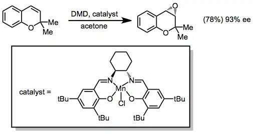 Enantioselektivní epoxidace dioxirany využívají jeden z těchto postupů: (1) oxidaci dimethyldioxiranem za přítomnosti chirálního kovového katalyzátoru a následnou epoxidaci, nebo (2) epoxidaci chirálními dioxirany, připravovanými z katalytických množství ketonů a stechiometrických množství koncových oxidantů).[4] Do prvního postupu je možné zapojit salenové komplexy manganu.[6]