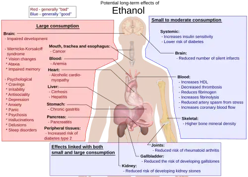 Při dlouhodobém a soustavném požívání etanolu dochází k řadě poruch, přičemž některé z nich se při abstinenci částečně nebo úplně zlepšují. Z orgánových změn jsou popsány cirhóza jater, záněty slinivky a jater, poruchy oběhové soustavy, (hypertenze, dysrytmie), může se vyskytovat neuromuskulární porucha svalů či nervů, v horším případě i nádory jater a žaludku, v těhotenství fetální alkoholový syndrom plodu. Psychicky může dlouhodobá konzumace alkoholu ve velkém množství vést k rozvoji demence.[7]