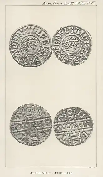 - ↑ LAWRENCE, Laurie Asher. Coinage of Aethelbald. The Numismatic Chronicle and Journal of the Numismatic Society. 1893, roč. 1893, čís. 13, s. 40–45. ISSN 2054-9172. (anglicky)