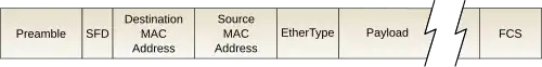 | 7 oktetů | 1 oktet | 6 oktetů | 6 oktetů | (4 oktety) | 2 oktety | 46(42)[3]–1500 oktetů | 4 oktety | 12 oktetů | |