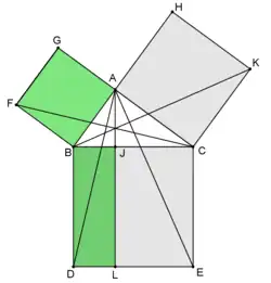 Eukleidův důkaz Pýthagorovy věty - V pravoúhlém trojúhelníku se obsah čtverce proti pravému úhlu rovná součtu obsahů čtverců u pravého úhlu. (Pýthagorova věta, při důkazu se objevuje formulace Eukleidovy věty o odvěsně.) [řešení]