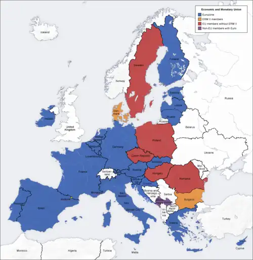 K lednu 2023 používala měny navázané na euro řada zemí a území: 2 členské státy EU zapojené do ERM II, 1 západobalkánský stát, 3 francouzská zámořská území, 3 malé ostrovní státy v Africe a 14 států střední a západní Afriky.[7]