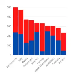 | Švédsko | 334 | 241 | 93 | 6 | 8 | 3 | 12 | 6 | 5 | 2 | 2 | 8 | 1 | 2 | 3 | 8 | 6 | 10 | 7 | 4 | ||||||||||||||||||||||||