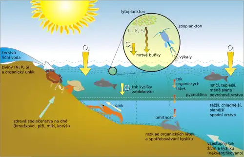 Důsledkem je nejprve přemnožení planktonu a také sinic (vodní květ) a posléze, po jejich masovém odumření, se projeví nedostatek kyslíku ve vodě (zejména u dna, kde ho odebírá tlení hmoty) a následné vymírání ryb a dalších organismů, zejména těch žijících u dna (toxické látky pocházející ze sinic, dekompozitorů a rozkládajících se organismů mohou však v extrémním případě působit na většinu či celou rybí populaci i další organismy v potravním řetězci). Přístupu kyslíku do spodních vrstev brání pyknoklina – vrstva oddělující vodu s odlišnou hustotou.