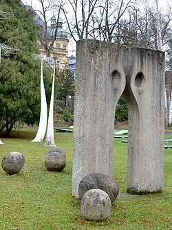 - 1969 Brána snů (spišský travertin, v. 285 cm), Liberec (s. J. Novákem)