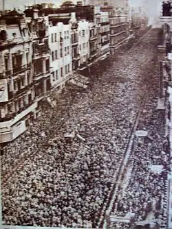Ve stejnou dobu začala mít argentinská vláda problém kvůli bouřícím se odborům, které byly tvrdými zastánci Peróna. Tato snaha vyvrcholila 17. října, kdy se uskutečnil velký pochod, který nazvali Den věrnosti (Día de la lealtad). Podle tradiční verze argentinského lidu ho organizovala sama Evita, ale historikové tuto variantu zpochybňují. Eva neměla v této době politickou podporu ani v okolí Juana Peróna a neměla se jak s odbory spojit. Někteří tvrdí, že dokonce v den protestů byla u své matky v Juníně a nemohla se tak účastnit demonstrace v Buenos Aires. Protesty byly masivní. Zúčastnilo se jich okolo 500 000 dělníků, odborářů a tzv. Descamisados (bez košile/trika), nejchudších obyvatel Argentiny. Vláda byla nucena k reakci. Policie i armáda odmítly zasahovat proti demonstrujícím. Prezident rozhodl, že Perón bude převezen do prezidentského paláce, což mělo podle představy politiků demonstrace ukončit. Když Perón přijel do paláce, začala jednání, při kterých se rozhodlo, že Perón veřejně vystoupí na demonstraci, bude propuštěn z vězení a vláda rezignuje. Perón slíbil odchod do důchodu a požádal o vypsání svobodných voleb na začátek roku 1946. Perón následně vítězně vystoupil na balkón, demonstrantům oznámil svůj odchod z armádního života a vyzval je k nenásilným protestům.