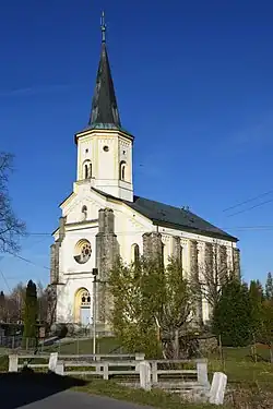 Po stranách vstupu jsou ve dvou úrovních úzká, půlkruhově zaklenutá okna. V nárožích jsou kamenné opěrné pilíře. Okolo celého kostela prochází korunní římsa s ozdobným zubořezem.