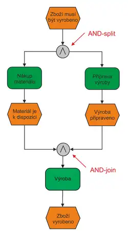 - AND (a současně) se značí znakem „∧“ nebo „+“. Spojkou AND-split vyjadřujeme rozdělení souběžných toků činností. Naopak spojku AND-join vyjadřujeme spojení toků do jednoho. Tato spojka se využívá pro synchronizaci toků.