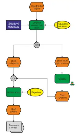 Příklady funkcí jsou "přijetí objednávky ", "kontrola materiálu na skladě", atd.