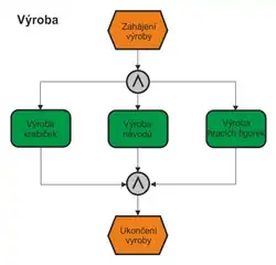 Aby hrací sada byla kompletní, musí obsahovat všechny 3 části hry. Je tedy nutné toky opět spojit synchronizační spojkou AND-join, aby nenastala situace, při které se vyrobí dříve návody, než ostatní komponenty a nenastala by předčasně událost „Ukončení výroby“. Spojka musí propustit tok dále jedině v případě, že všechny aktivity nad ní jsou dokončené. Pokud se tok procesu dostane do události „Ukončení výroby“, pod proces skončil a tím je splněná aktivita „Výroba“ z hlavního procesu.