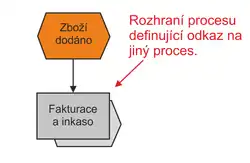 6) Rozhraní procesu definuje odkaz na jiný proces, má podobnou vlastnost jako proces vnořený (používá se vždy po události). Je to značka, která zlepšuje přehlednost diagramu. Využívá se hlavně u dlouhých procesů, které je nutné rozdělit do menších částí kvůli jejich čitelnosti. Je to tedy značka rozdělení. Rozhraní procesu v EPC diagramu znázorňuje obdélník, který z velké části překrývá element události. Viz obrázek 5.
