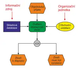 V následném kroku jí tedy budeme muset zpracovat a tím definovat všechny aktivity a události v procesu obsažené. Pokud obdržíme objednávku, spustíme tím aktivitu „Ověření dostupnosti zboží“. Za zpravování této aktivity bude zodpovědná organizační jednotka „Obchodní oddělení“. Tým obchodního oddělení bude při aktivitě využívat informace, které napoví, jestli hru máme na skladě nebo je potřeba hru vyrobit. Informace se čerpají z informačního zdroje „Skladová databáze“. Další krok bude vložení spojky XOR-split do procesu, který určuje, jaký daná aktivita bude mít výsledek. Spojka s aktivitou souvisí a tak má aktivita dva nezávislé výsledky událostí – „Zboží k dispozici“ a „Zboží musí být vyrobeno“. Jiná situace v tomto případě nemůže nastat. Provede se jedna z těchto událostí:
