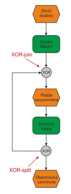 - XOR (vzájemně se vylučující nebo) se značí písmeny „XOR“ nebo znakem „X“. Spojkou XOR-split vyjadřujeme rozpojení toku procesu do jedné z možných cest. Spojka XOR-join se chová podobně jako spojka OR-join s tou výjimkou, že pokud tok dorazí k bodu jejich sloučení, musí (je zde jasně definováno, co tok musí udělat) pokračovat dál v cestě, aniž by čekal na další z toků. Spojka tedy neslouží, stejně tak jako v předešlém případě, k synchronizaci toků procesu. Viz obrázek 3.