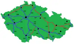Nejvýznamnějším evropským dopravním tahem v Česku je z tohoto hlediska dálnice D1 mezi Prahou a Brnem, po níž je společně vedena páteřní silnice ve směru západ–východ (E50) i sever–jih (E65), na úseku Praha – Mirošovice dokonce i další páteřní silnice sever-jih (E55; bude výhledově odvedena na plánovanou dálnici D3).
