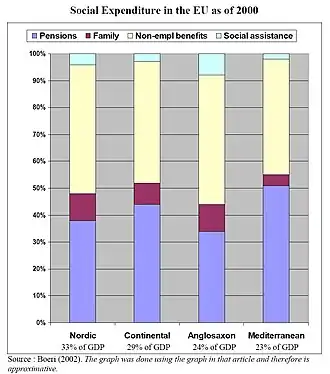 Dle toho, na které aspekty sociálního státu je kladená větší váha, jsou definované čtyři kategorie evropského sociálního modelu: severský, kontinentální, anglosaský a středomořský model.[3]