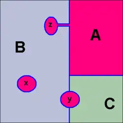 x: Část státu A, nesouvislá s ním, jeho exkláva. Ba dokonce je i enklávou: Hřebíkem (clavus) v území jediného státu B.