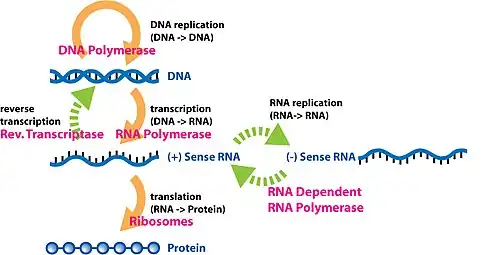 Genová exprese je shrnuta v centrálním dogmatu molekulární biologie, které poprvé formuloval Francis Crick v roce 1958 a dále rozšířil o následné objevy reverzní transkripce a replikace RNA v roce 1970.