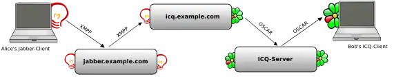 Co se děje při komunikaci mezi dvěma uživateli, ukazuje názorný příklad. Uživatelka Julie má účet na serveru Kapuletova.cz, takže její JID má tvar julie@kapuletova.cz. Chce si povídat s Romeem, jehož JID je romeo@montek.com. Když Julie napíše zprávu a pošle ji Romeovi, provede se několik akcí: