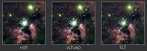 Porovnání snímků z Hubbleova kosmického dalekohledu (vlevo), dalekohledů VLT s modulem adaptivní optiky (uprostřed) s předpokládaným zobrazením pomocí Extrémně velkého dalekohledu (vpravo)