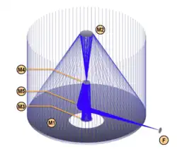 Schéma optické konfigurace dalekohledu se zrcadly M1 až M5. F – Nasmythovo ohnisko.