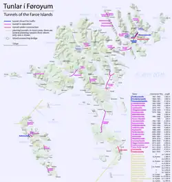 - ↑ a b c Faerské ostrovy otevřely podmořskou síť tunelů, střídání barevného nasvícení ozvláštňuje kruhový objezd. ČT24.cz [online]. 2020-12-19 [cit. 2020-12-19]. Dostupné online.