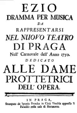 Původní Ezio je plnohodnotná opera seria bez známek pozdější tzv. Gluckovy „reformy“. Premiéru měla v divadle impresaria Giovanniho Battisty Locatelliho na ulici v Kotcích (české „Divadlo v Kotcích“, německy „Kotzentheater“) a udržela se po dvě sezóny.