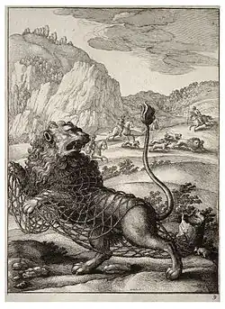 - Lev daruje myši život. Ta se mu odmění tím, že přehryže provaz sítě, do které lovci lva chytili.