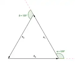 nebo pomocí kosinové věty v komplexní rovině (nebo trigonometrické identity pro rozdíl úhlů):