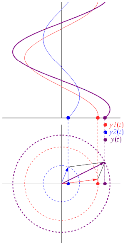 Na sčítání lze také pohlížet tak, že provádíme vektorový součet dvou vektorů se souřadnicemi [ A1 cos(ωt + θ1), A1 sin(ωt + θ1) ] a [ A2 cos(ωt + θ2), A2 sin(ωt + θ2) ], jehož výsledkem je vektor se souřadnicemi [ A3 cos(ωt + θ3), A3 sin(ωt + θ3) ]. (viz animace)