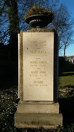 Datum pohřbu není v matrice zemřelých uvedeno.[4] | Lankrabě. C. k. poručík řadového pěšího pluku č. 25 Thierryho svobodného pána de Vaux.[4] Zemřel ve věku 23 let na břišní tyfus jako důsledek zranění levé kolenní kosti (čéšky), které utrpěl v bitvě u Drážďan 27. srpna 1813.[4] | |
