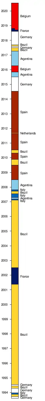 Významným zlomem bylo Mistrovství světa 1994. V jeho průběhu se do čela ještě (do roku 2014 naposledy) dostalo Německo, ale po finálovém utkání obsadila první místo na téměř 7 let (doposud nejdelší doba) Brazílie. Z čela ji zprvu nesesadilo ani vítězství Francie na Mistrovství světa 1998 i Mistrovství Evropy 2000, ale o rok později jí nakonec vedoucí příčku přepustila. Vítězství na Mistrovství světa 2002 však znovu katapultovalo do čela žebříčku Brazílii, kde setrvala až do února roku 2007.