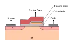 Jedno hradlo je ovládací (CG – control gate), druhé je plovoucí (FG – floating gate), izolované od okolí vrstvou oxidu. Jelikož je FG izolované, všechny elektrony na něj přivedené jsou zde „uvězněny“. Tím je uložena informace.