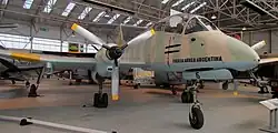 ![Pucará s prezentací výběru možné podvěsné výzbroje. Podle „01“ na krytu předního podvozku by se mělo jednat o A-501 – první sériově vyrobený stroj. A-501 byla přijata do služby v listopadu 1974, během války o Falklandy byla umístěna na BAM Santa Cruz a vyřazena 1987. Následně používána v Escuela de Suboficiales de la Fueza Aéra k pozemnímu výcviku[1]](./Pucara_armamento_picture.jpg)